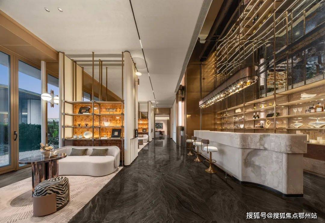 立面方面,汲取现代轻奢法式的白金美学灵感,叠加大面玻璃,打造出光影灵动的对称式金色画框立面。