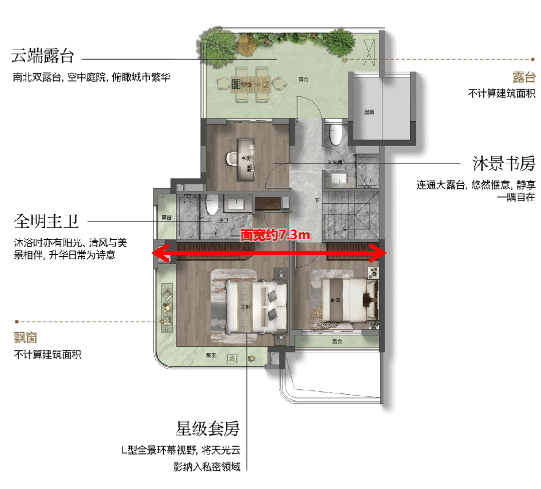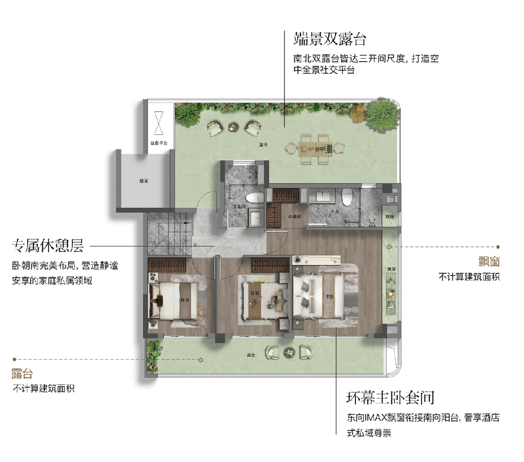 配备独立卫浴与衣帽间,营造出酒店式居住体验。最令人惊叹的是南北双露台的配置,为盆栽园艺、星空茶室、阅读角落等个性化生活场景提供了无限可能。