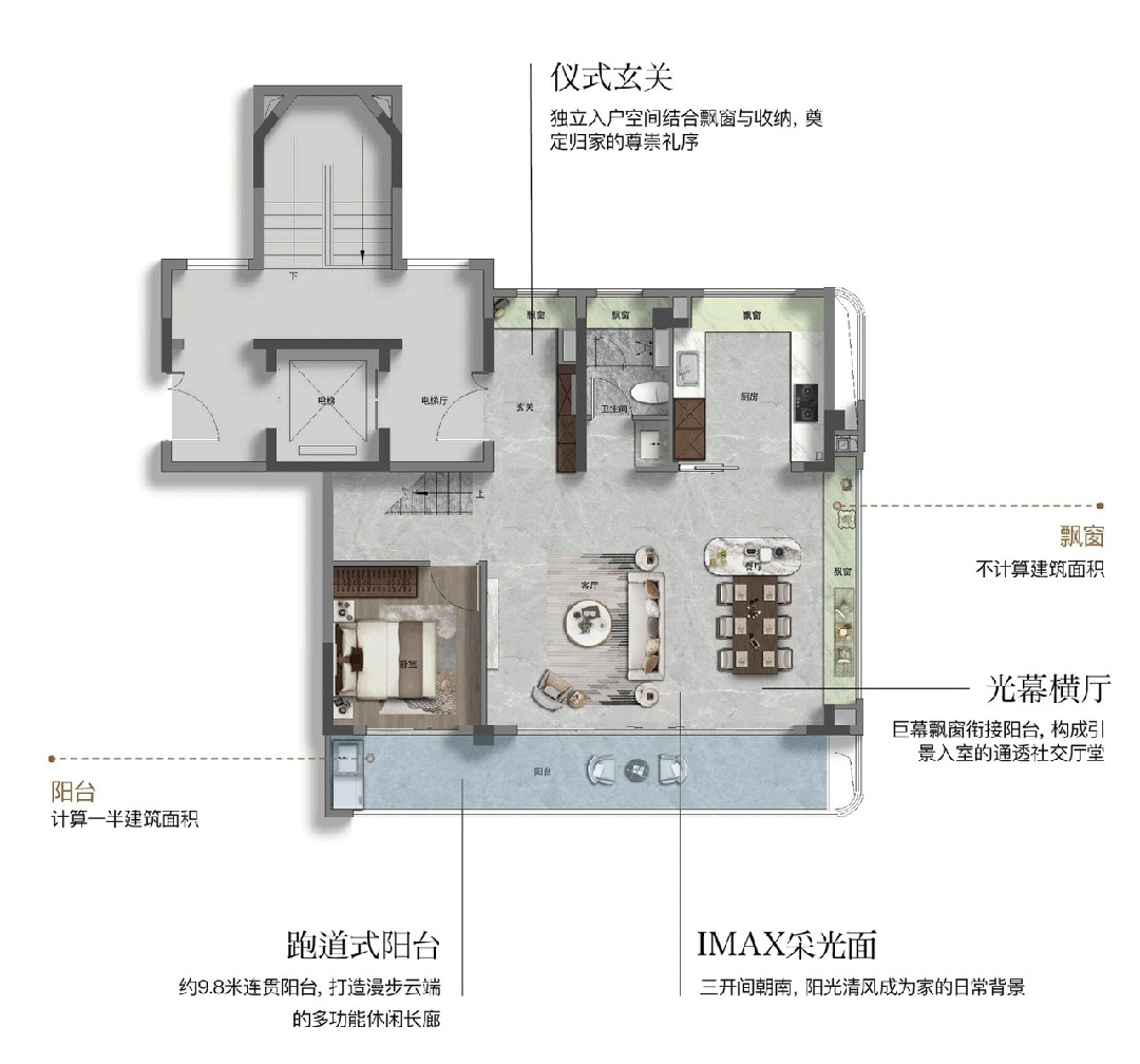全屋飘窗全赠送约9.8㎡,配合约7.2㎡的大阳台(计一半建筑面积)不仅增加了实际使用面积,更在视觉上提升了空间的通透感。