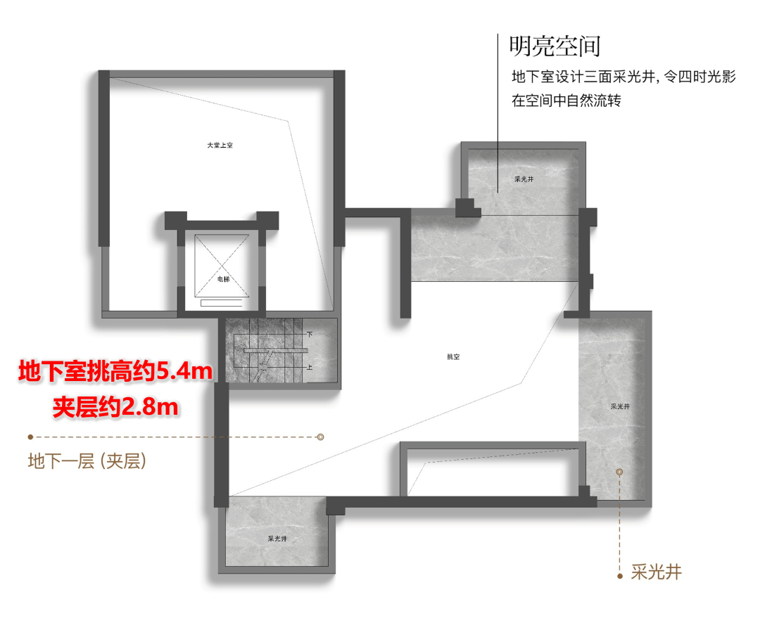 配合采光井的设计(地下室面积约125㎡),有效解决了传统地下室昏暗潮湿的痛点,将其变为一个可自由定义的功能场域。无论是打造为私人藏酒阁、专业级视听室,还是禅意茶室,皆能随心所愿。