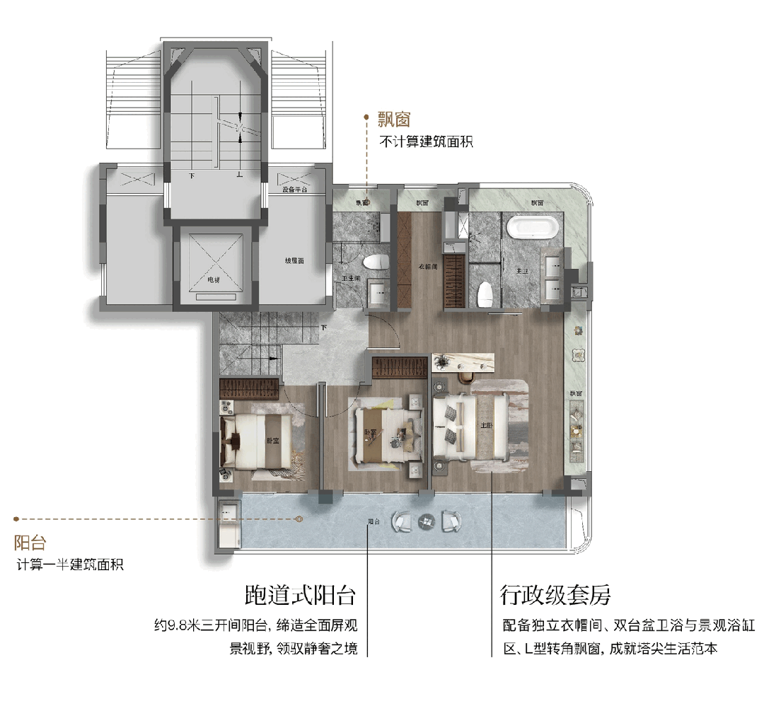 两大270°转角飘窗,在同面积段产品中实属罕见,瞬间将睡眠区的景观层次与奢华感拉升到新的高度。