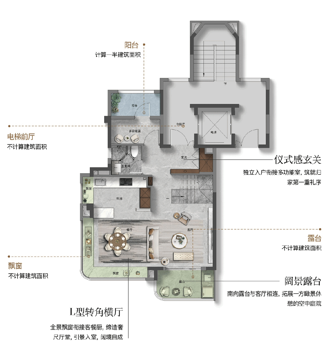 如果说112㎡户型是平面空间的极致利用,那么约144㎡的上叠户型则开启了垂直生活的无限遐想。其建筑面积约144㎡,但通过巧妙的挑空、露台及灵动空间设计,实际可使用面积高达约180㎡,实得率约125%,