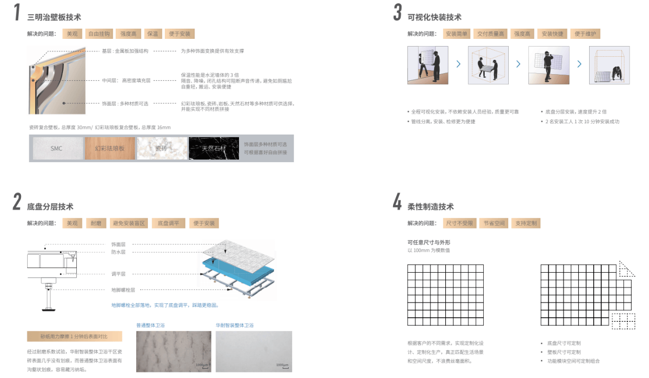 华耐智装在产品研发上始终坚持以市场需求为导向,推出了包括整体卫浴系统、整体厨房系统、隔墙系统、地面系统、墙面系统等工业化内装部品系统单元,可灵活组合满足住宅、公寓、商业、办公、酒店、医疗、适老、康养、教育等不同应用场景和交付需求。