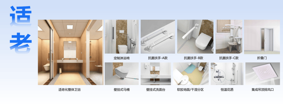 面向医养领域,华耐智装在原有整体卫浴的基础上进行多功能设计,打造了专为老年人群体量身定制的适老型整体卫浴,旨在为老年人创造更加安全、舒适、便捷的卫浴环境。